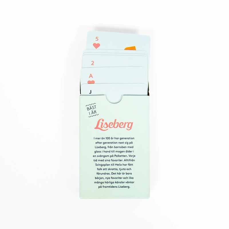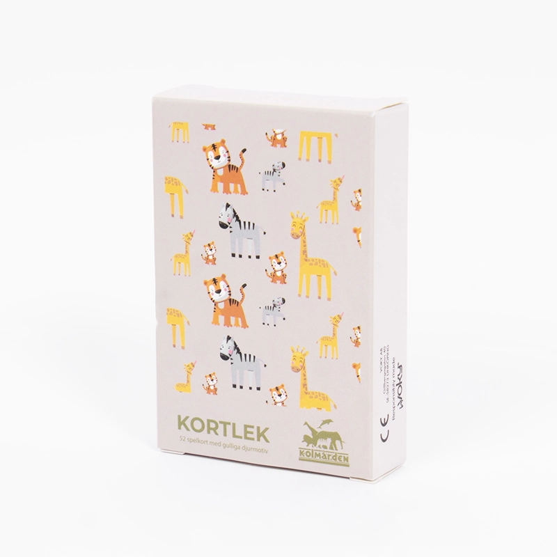 | Material: | 300 eller 350 g/m² 'Art Paper' för korten. För spelkortsasken 300 g/m² 'cardstock paper'. Alla med Glossy Varnish. |